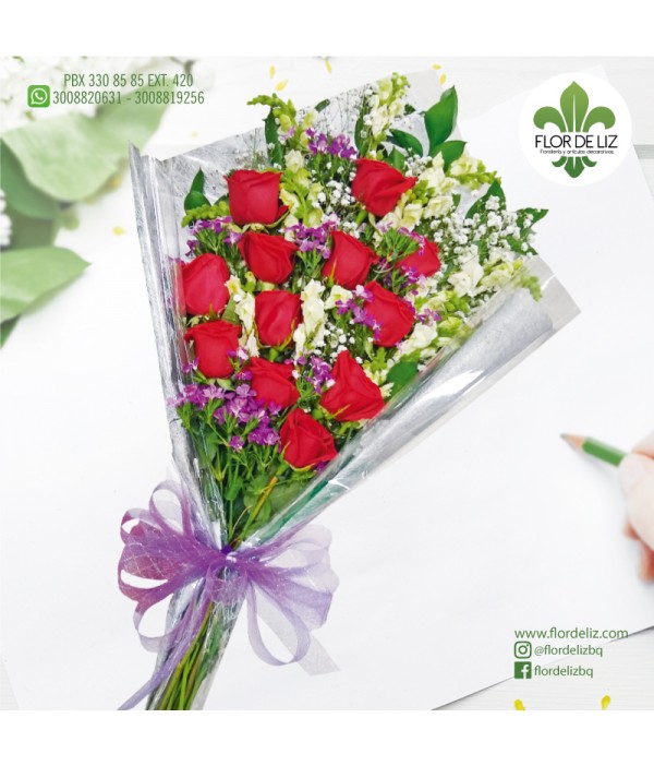 Ramillete de 12 rosas acompañadas de rusgo, gipsofila, papel decorativo y lazo.