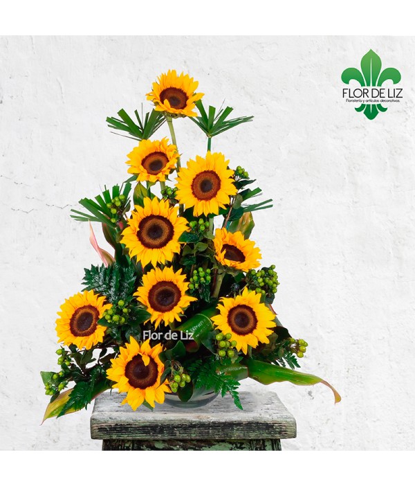 Arreglo elaborado en Girasoles, Papiros e Ipérico verde, acompañado de follaje, base de vidrio (sujeta a cambio por existencia en inventario)