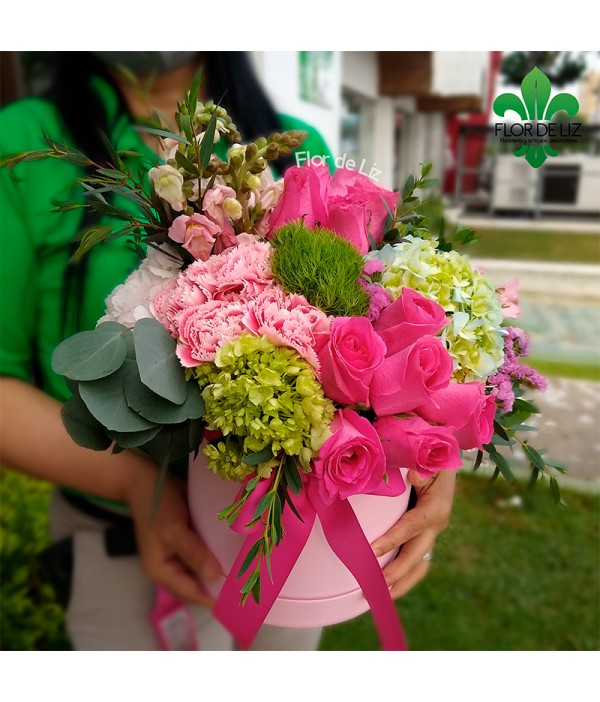 Caja en rosas fucsias, claveles rosados, hortensias, eucalipto, boca dragón, grimbol, lazo razo fucsia.