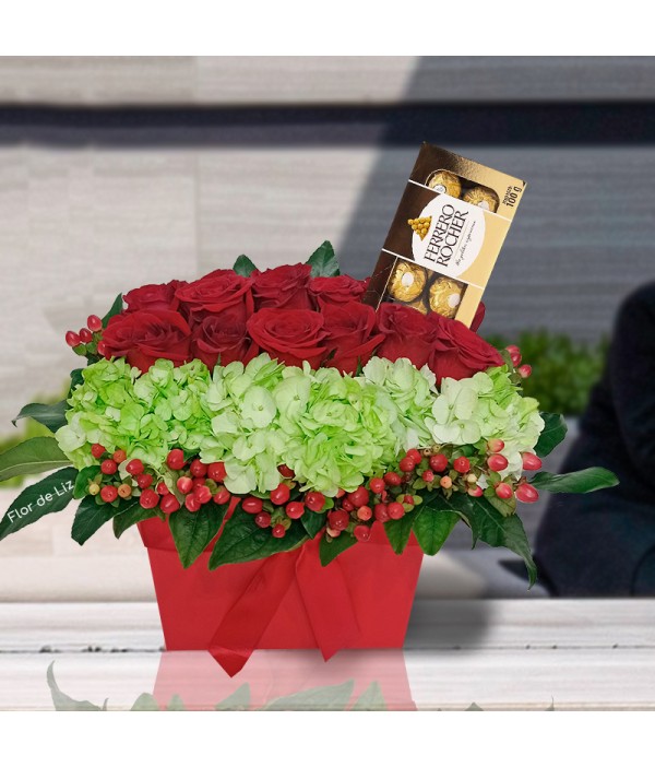 CAJA EN 12 ROSAS ROJAS Y HORTENSIAS VERDES ACOMPAÑADO DE FOLLAJE EN HIPÉRICO ROJO, CAJA CHOCOLATES FERRERO X8 UND.