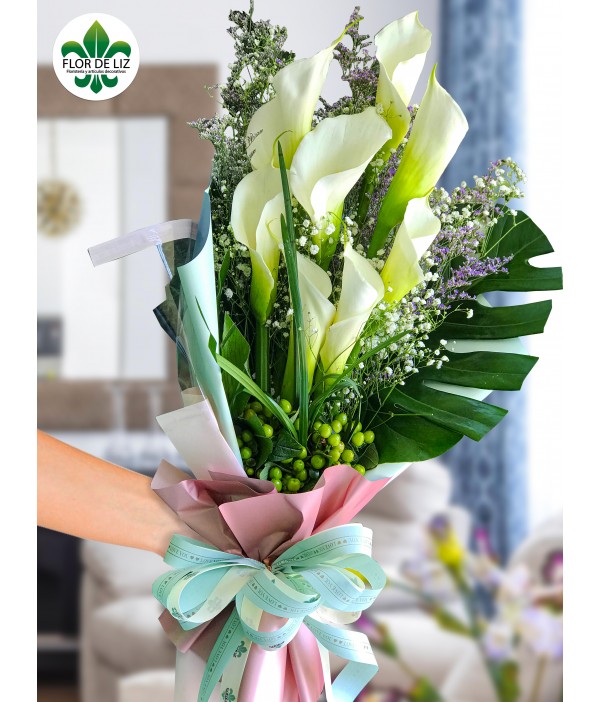 Ramillete elaborado en Cartuchos, Cafeto verde, Gipsophyla, Caspia y Hoja de Balazo