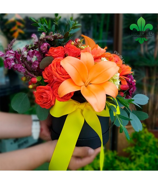 Hermosa caja elaborada en rosas anaranjadas, lirios, claveles, gipsi morada, boca dragón, eucalipto, hiperico rojo, lazo razo amarillo. COLOR DE CAJA SUJETO A CAMBIO.
