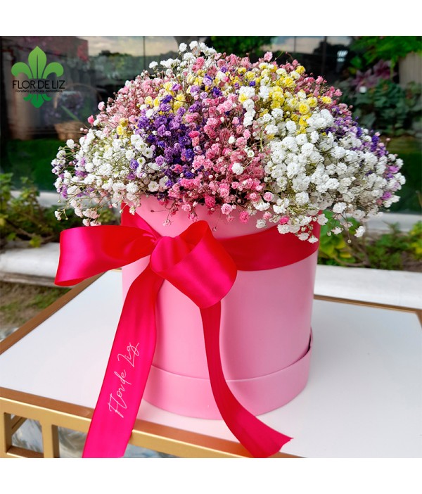 Hermosa caja decorada en gipsophila colores surtidos y lazo de razo. COLOR DE CAJA Y LAZO SUJETOS A CAMBIOS.