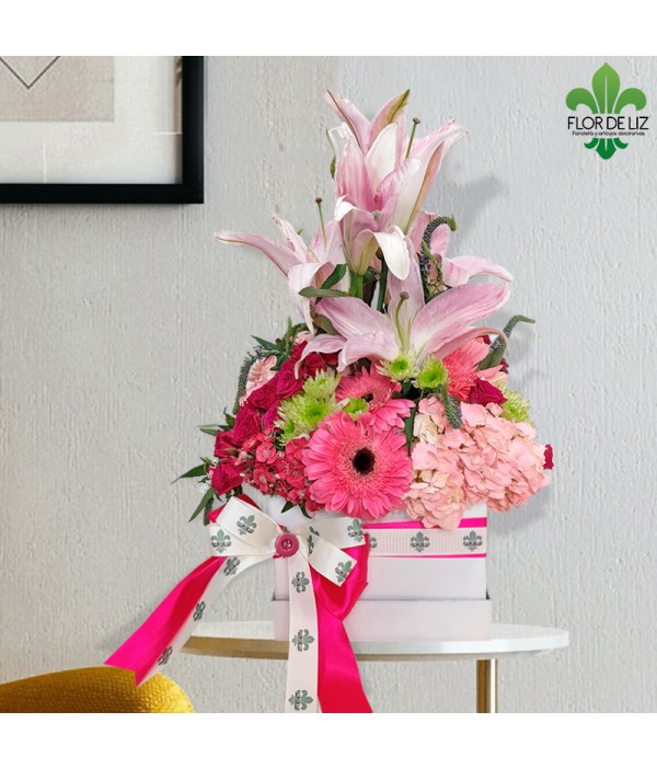 Hermosa caja cuadrada elaborada en preciosas gerberas rosadas y fucsias, hortensias, lirios rosados, mini rosas fucsias, gipsi y coquetas.