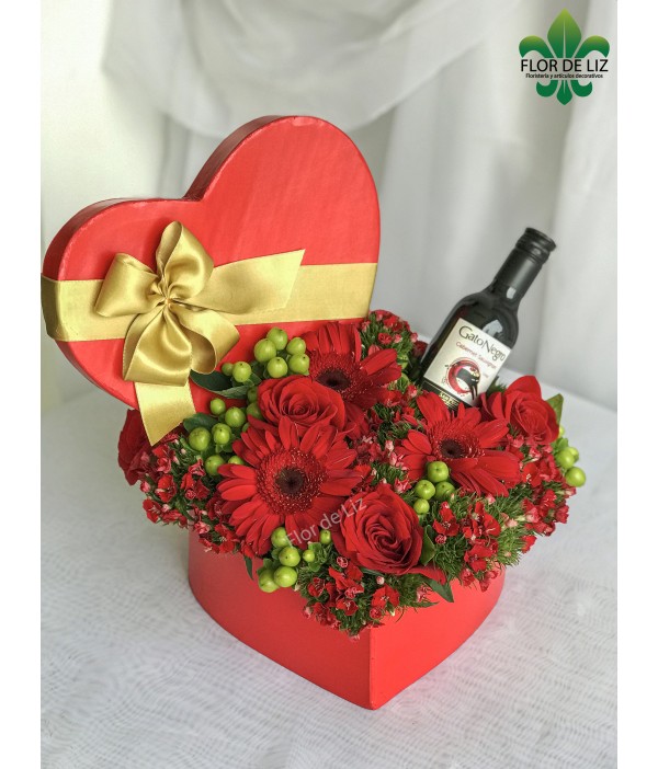 Hermosa Caja Decorada en Gerberas, Rosas y Vino Gato Negro.
