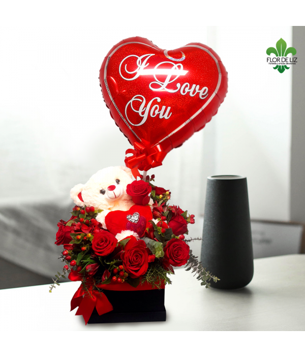 Hermosa Caja Decorada en Rosas Rojas, Hiperico Rojo y Peluche