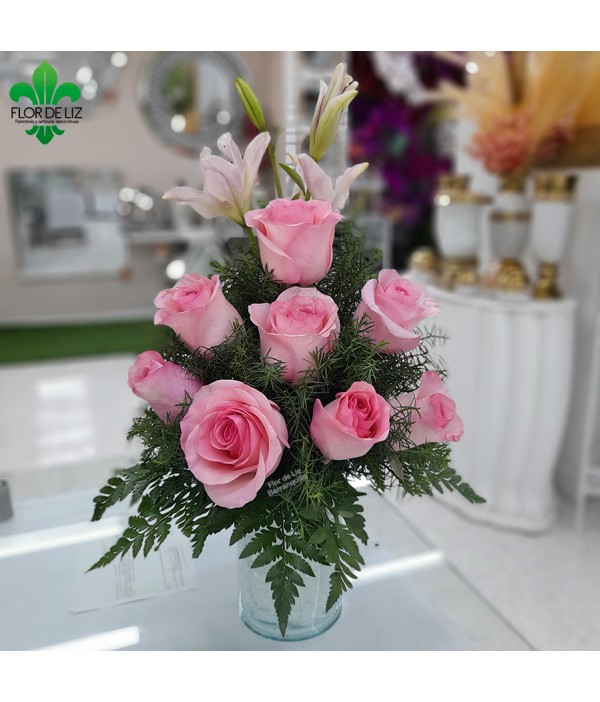Mini arreglo elaborado en rosas rosadas, lirios rosados, helecho cuero, base aluminio.