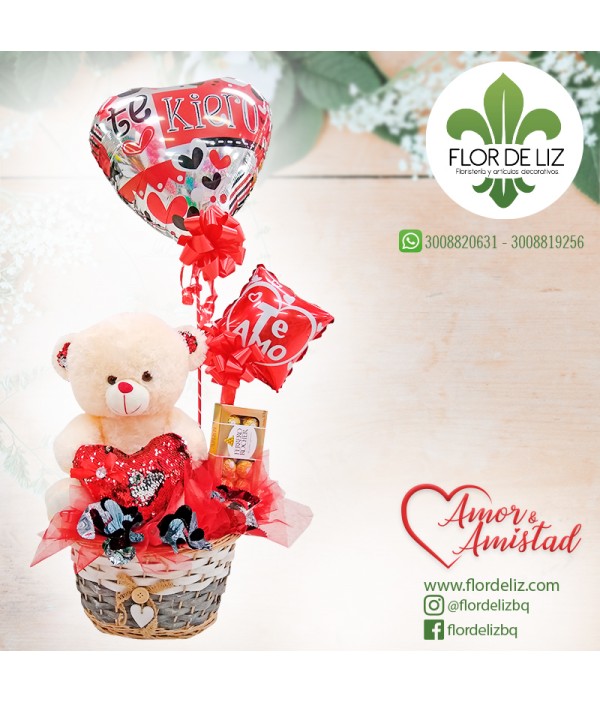 Hermoso arreglo en canasto, peluche, globos corazones, chocolates ferrero.