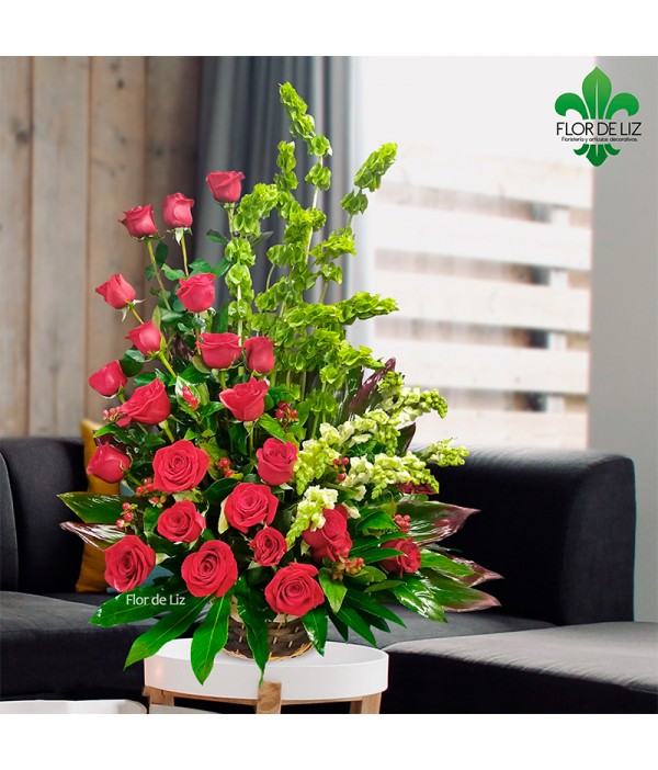 Arreglo en rosas rojas, boca de dragón, follaje, base canasto