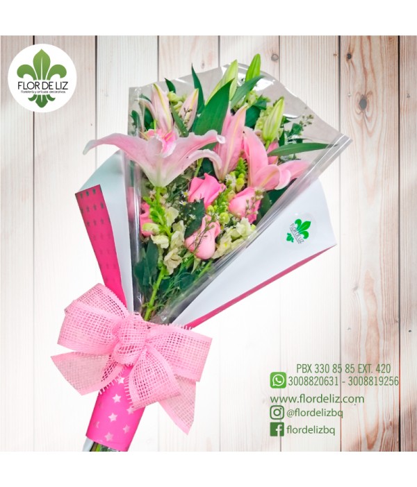 Hermoso ramillete elaborado en rosas, lirios, boca dragón, follaje, lazo en malla.
