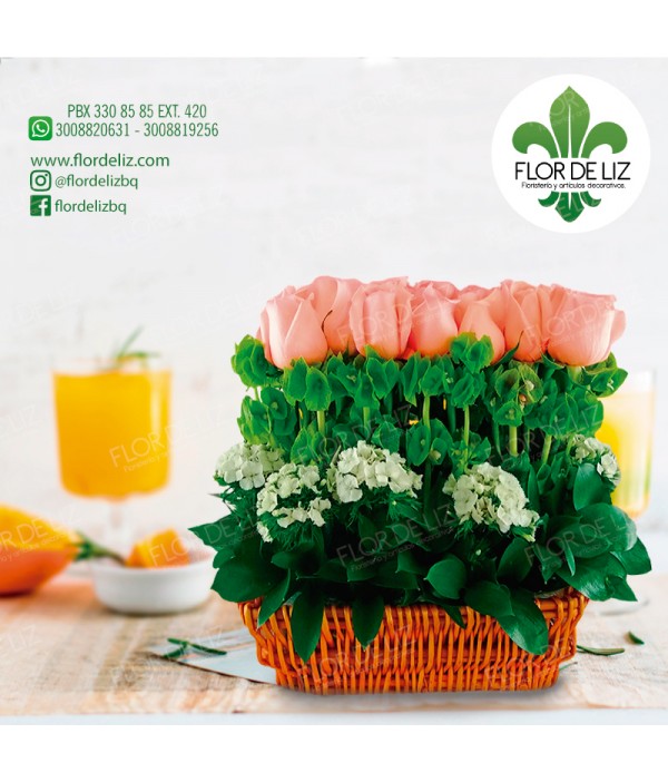 Arreglo en canasto de rosas, campana Irlanda, follaje.