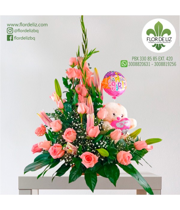 Hermoso arreglo en rosas, lirios, gladiolos, follaje, globo, peluche, base canasto.