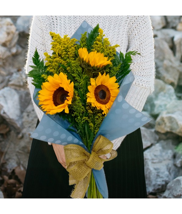 Ramillete en 3 girasoles, follaje en solidaster y pino canadiense, lazo en malla.