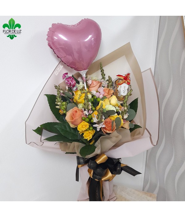 Ramillete elaborado en rosas corales y amarillas acompañado de follaje en boca dragón, hipérico verde, eucalipto y manito de Dios. Globo peq. chocolate x2 y unidad bola de chocolate.