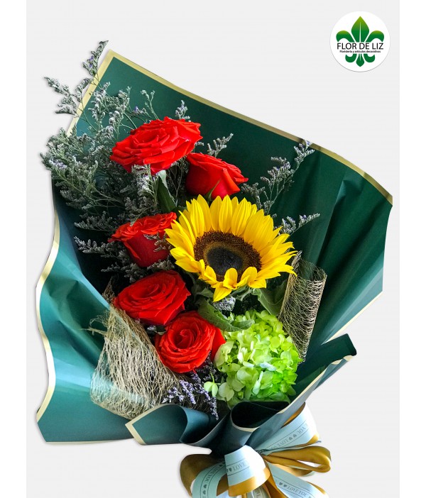 Hermoso ramillete elaborado en rosas rojas, girasol, caspia y hortensias.