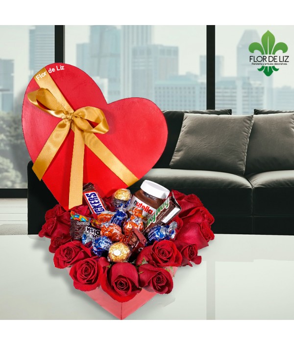 Caja corazón elaborada en rosas rojas y chocolates surtidos cono nutella, snickers, ferrero, choco disk entre otros.
