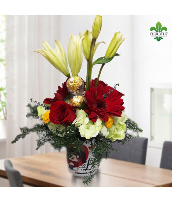 Mug elaborado en rosas rojas, hortensias, gerbera, lirios, pinopio + chocolate ferrero.