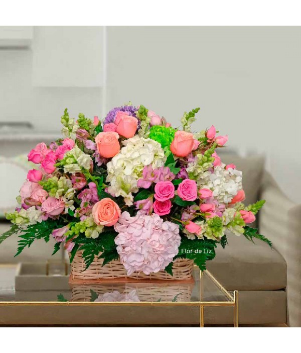 Canasto elaborado en rosas surtidas, hortensias y follaje.