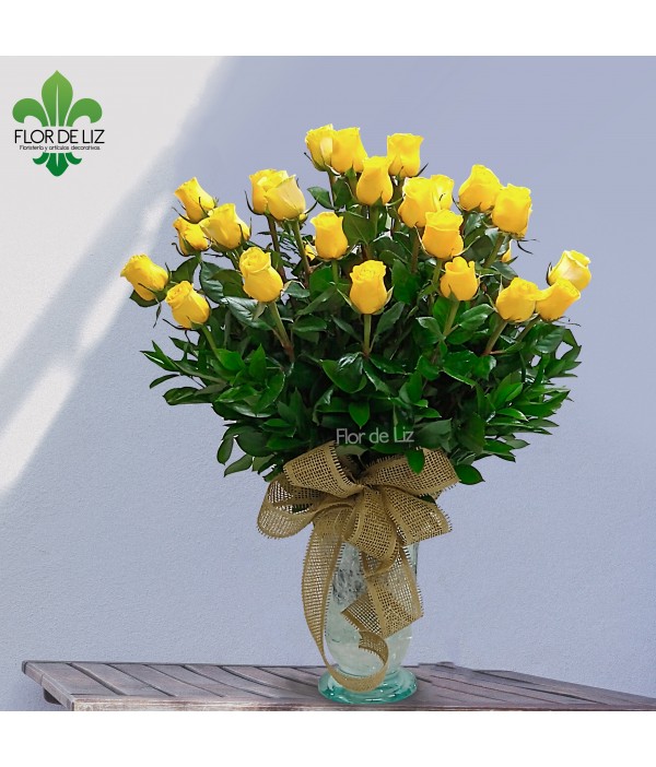 Arreglo en rosas amarillas, rusgo, lazo en malla, base vidrio.