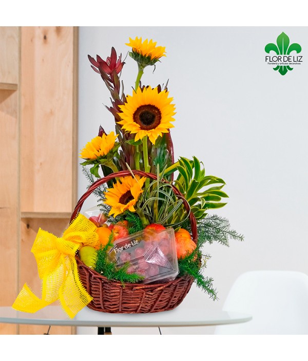 Frutero en canasto importado, girasoles, galateas, mcanción de la india, pino, lazo en malla, cintilla, hoja de carey, frutas
