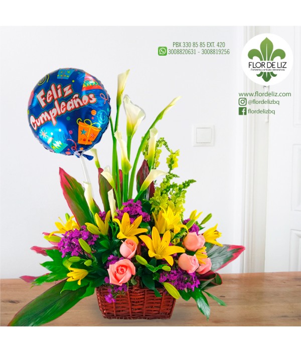 Arreglo en base canasto, lirios, rosas, gipsy lila, cartuchos, globo grande, rusgo, manito de dios, boca dragón y hoja de carey.