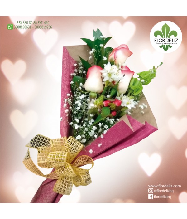 Ramillete en Rosas, Gipsophilia, Follage, lazo en malla.