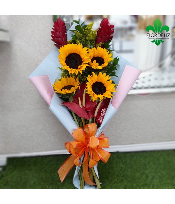 Ramillete exótico elaborado en anturios, girasoles, ginger, hipérico, follaje, envoltura en papel fino.