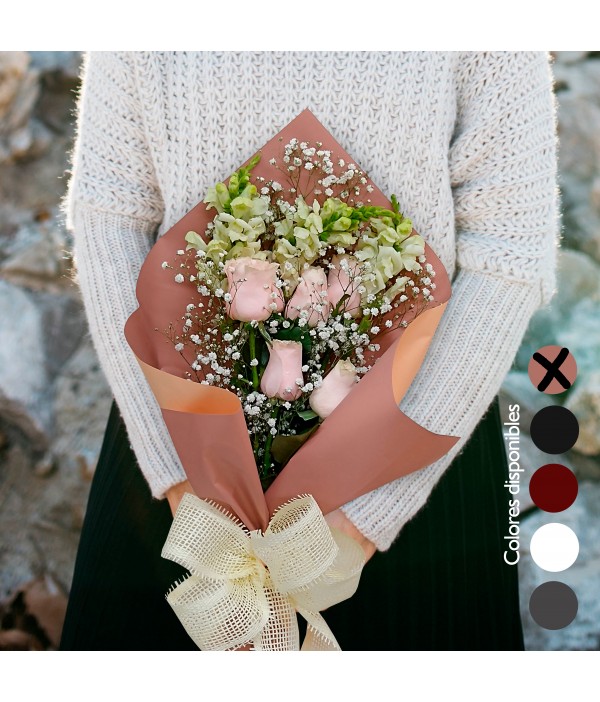 Ramillete en 5 rosas rosadas, boca dragón, gypsophila, lazo en malla, envoltura en papel fino color ocre.