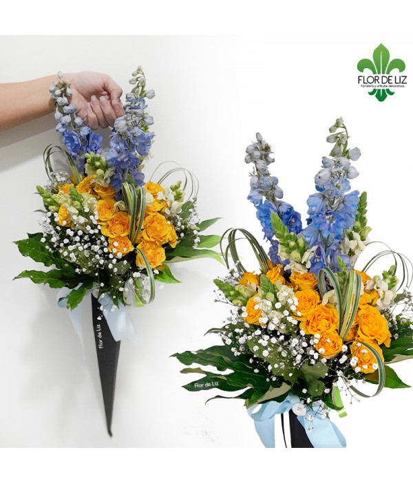 Ramillete en cono con mini rosas amarillas acompañado de follaje en gipso, delfinios, cintilla, manito de Dios y boca dragón. Empaque sujeto a cambio según disponibilidad en inventario. |