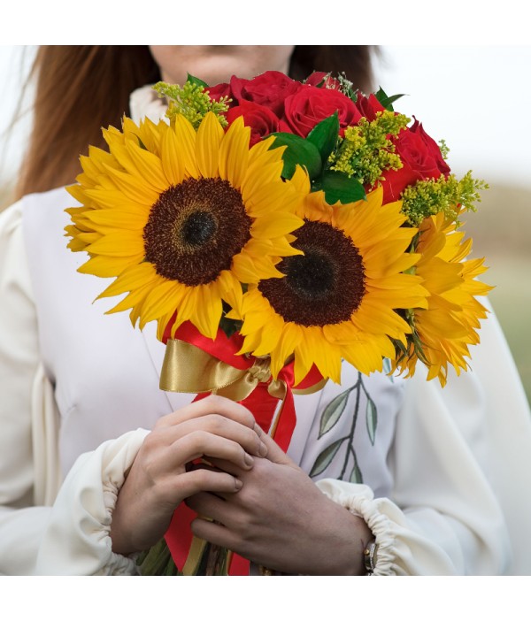 Ramillete elaborado en aprox. 6 girasoles y 10 rosas rojas acompañado de follaje en rusco y solidaster. lazo de Razo dorado con rojo..