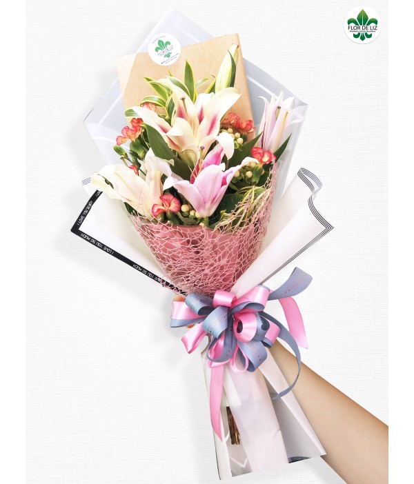 Ramillete elaborado en lirios y solomia, follaje en canción de la india y cafeto blanco.