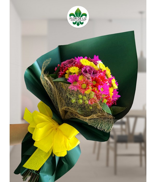 Hermoso y colorido ramillete elaborado en Rosas Fucsias, Cafeto Verde, Rusco, Clavellina y Margaritas de colores