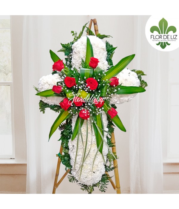 Cruz fúnebre elaborada en claveles, aplique en rosas rojas, follaje en hoja de lino, helecho cuero, gypsophila.