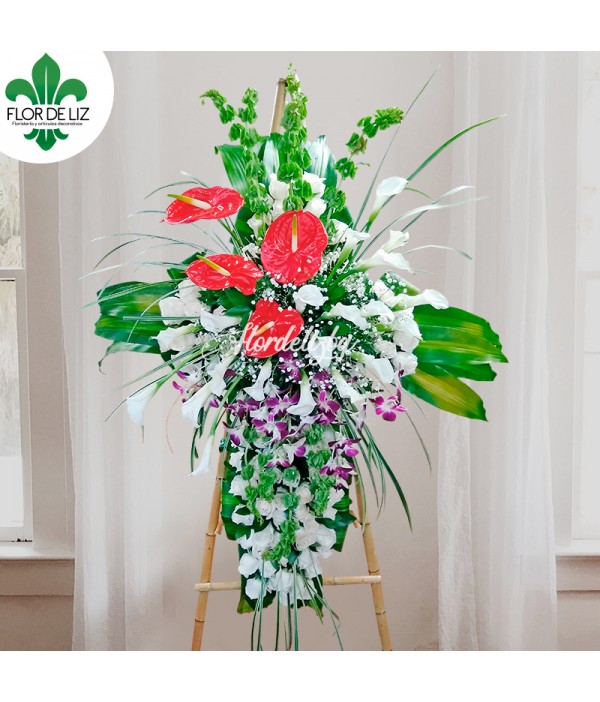 Cruz Fúnebre elaborada en rosas blancas, aplique en cartuchos, anturio, orquídeas, cintillas, gypsophila, hoja dracena y campana irlanda.