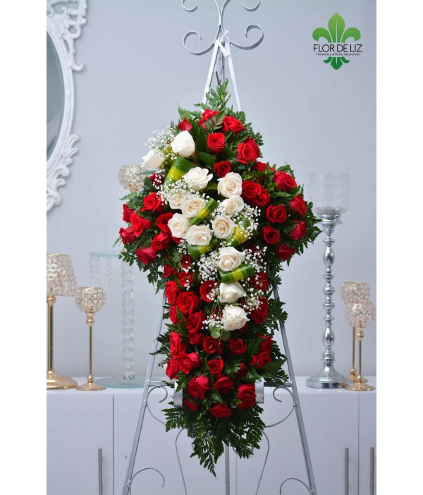 Cruz funebre en rosas rojas con aplique en rosas blancas