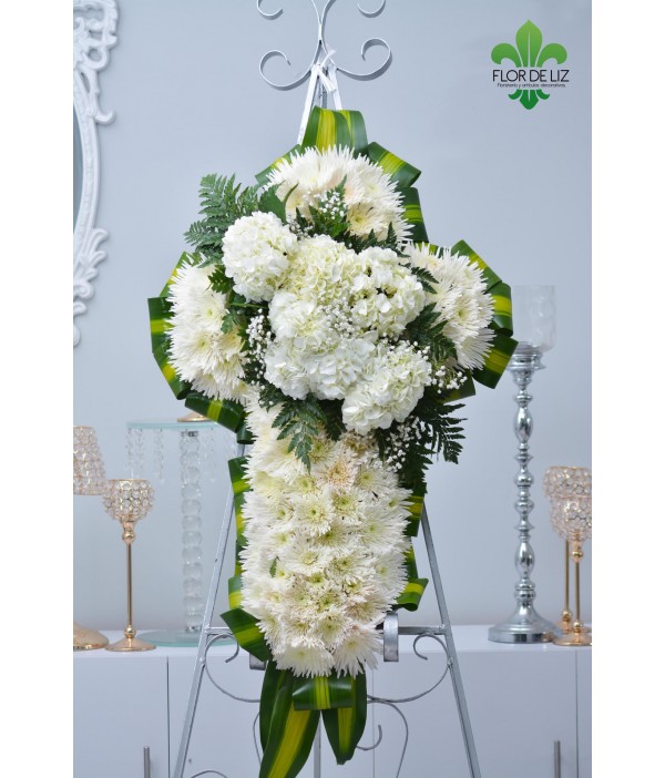 Cruz funebre en espaider blanco con aplique en ortencias blancas, gipsofilia, helecho cuero y hoja de dracena. *ATRIL (TRÍPODE) DE BAMBÚ.*CINTA ADICIONAL $30.000 |