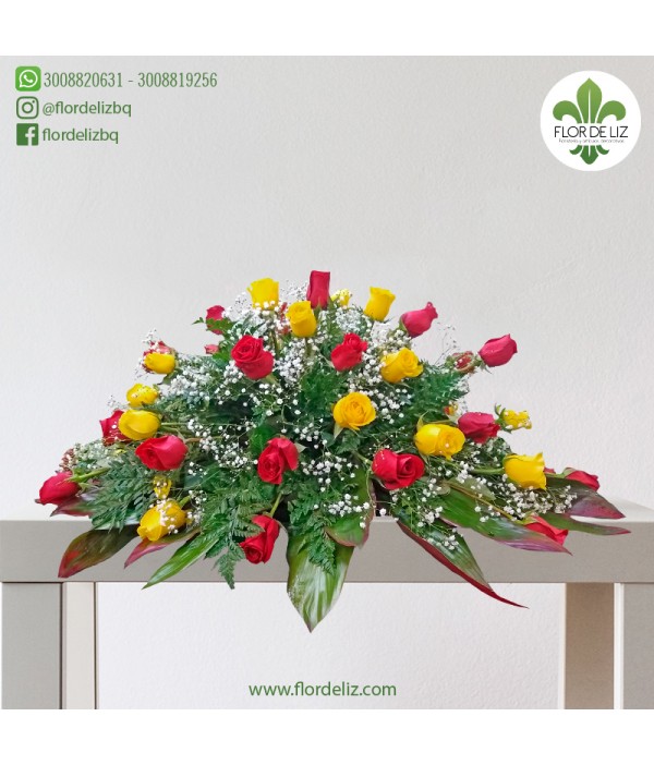 Sudario elaborado en rosas rojas y amarillas, hoja de carey, helecho cuero, gypsophilia.