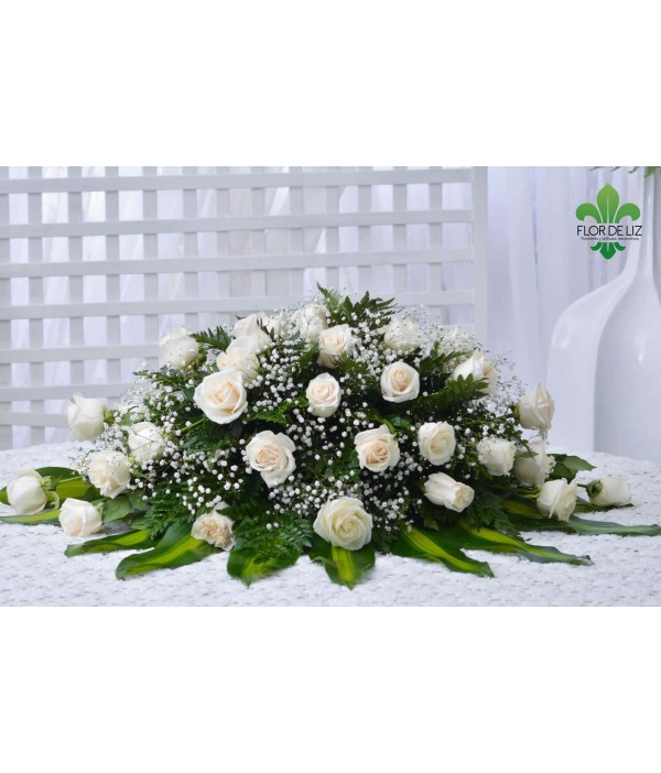 Sudario en rosas blancas con hoja de dracena, helecho cuero y gipsofilia.
