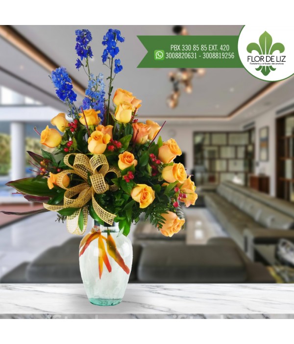 Arreglo en rosas, follaje, delfinios, lazo en malla, base vidrio.