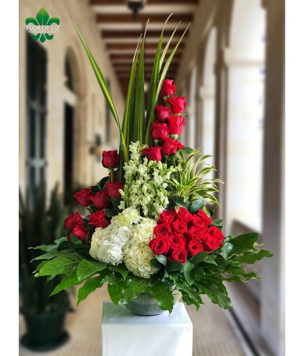 Hermoso arreglo en base de canasto con rosas, hortensias, boca dragón, follaje.