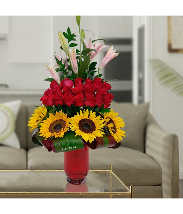 Arreglo elaborado en rojas rojas, 4 girasoles y lirios rosados acompañado de follaje en rusco y hoja de carey, Base de vidrio sujeta a cambio.