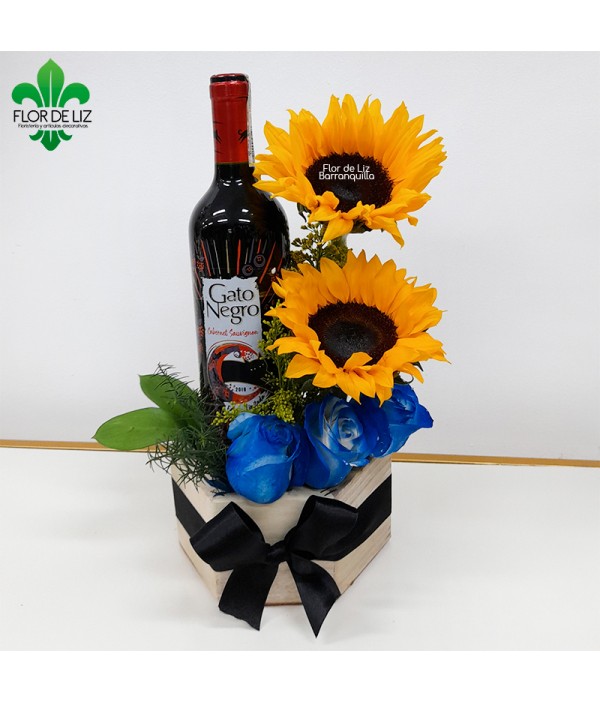| Arreglo en base de madera elaborado en 3 rosas azules, 2 girasoles y botella de vino. Botella de vino sujeta a cambio. |