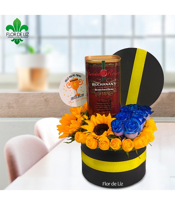 Caja decorada en 12 rosas amarillas, 3 girasoles, 8 rosas azules, botella Buchanans, topper papá.