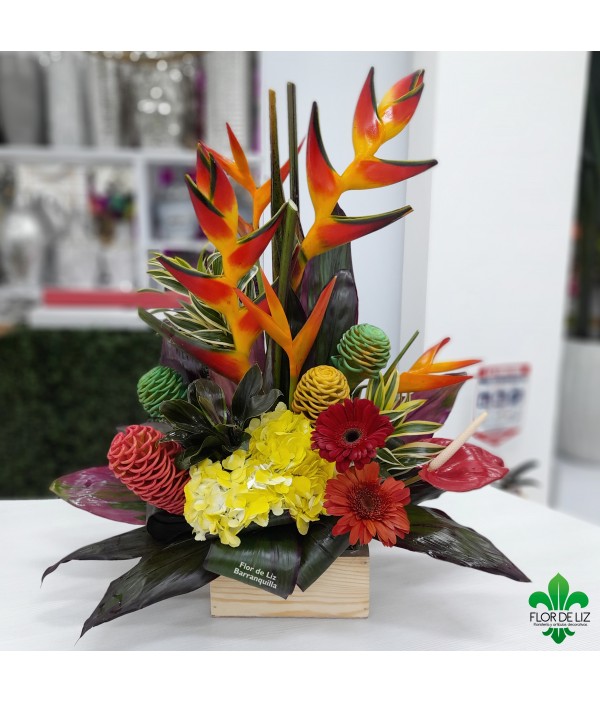 Arreglo exótico elaborado en maracoas, heliconias, hortensia, helecho cuero, hoja de carey, gerberas, grimbol, anturio,