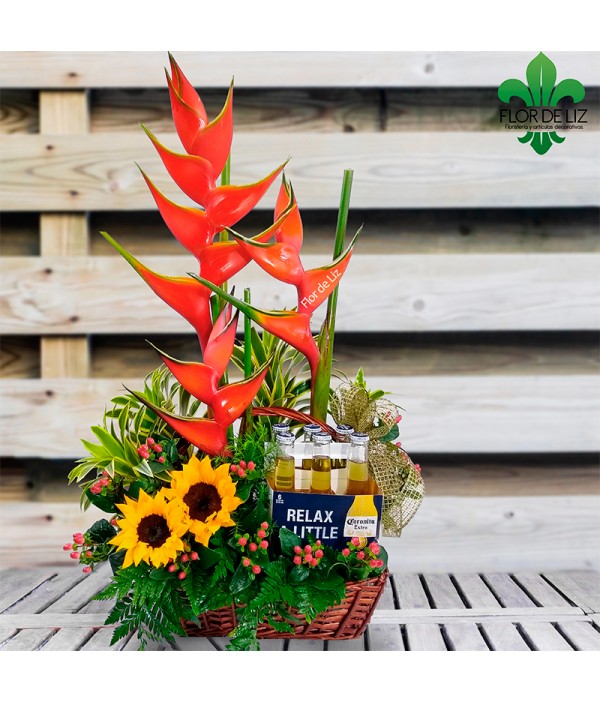 Arreglo en canasto importado, heliconias, helecho cuero, canción de la india, six pack de corona, hipérico rojo.