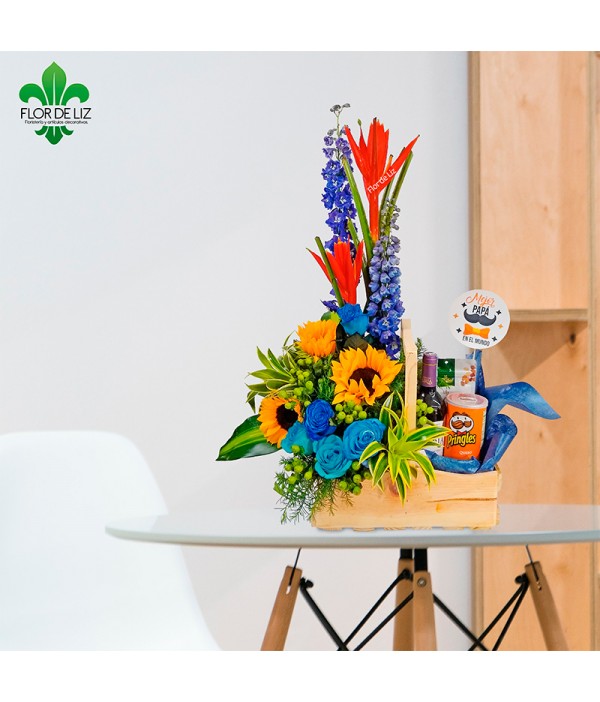 Arreglo en delfinios, musas, hipérico verde, pringle grande, canción de la india, girasoles, pino, topper papá, vino, maní grande.