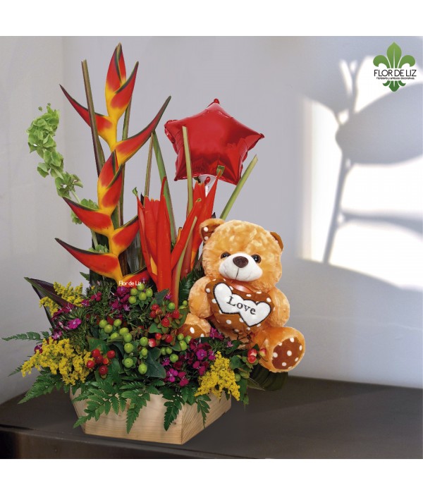 Arreglo en base de madera elaborado en heliconias y musas acompañado de follaje en helecho cuero, cafeto verde y rojo, solidaster, gipsi, hoja de carey y campana Irlanda. Peluche mediano y globo pequeño.