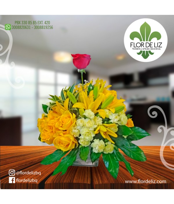 Hermoso arreglo en rosas, clavellinas, lirios, follaje, base en vidrio