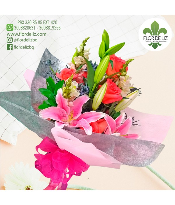 Elaborado en lirios, rosas, follaje lazo en malla.