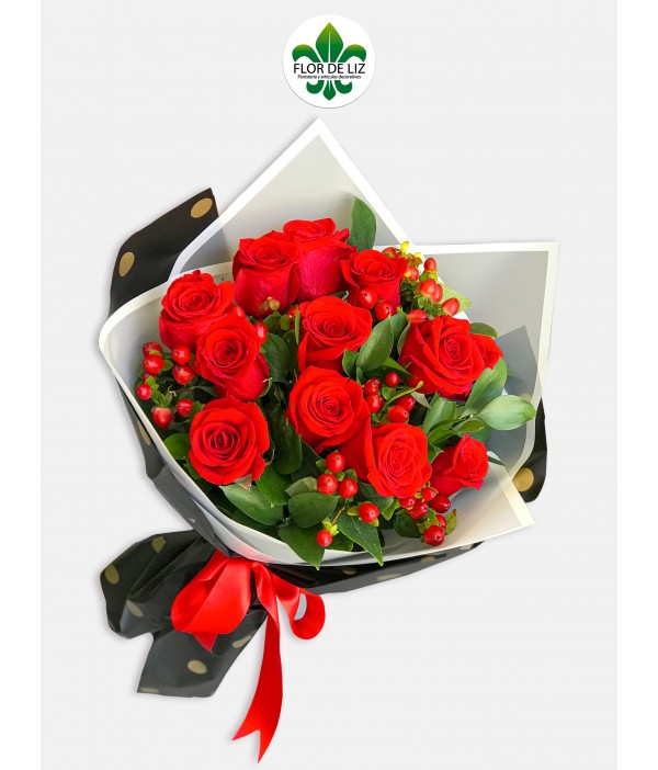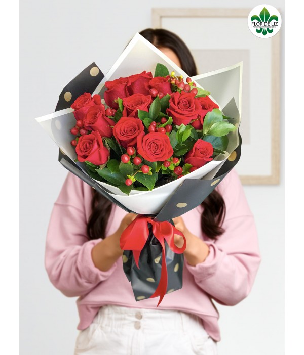 Ramillete elaborado en 12 rosas rojas acompañado de follaje en rusgo e hipérico rojo. Envoltura en papel fino y lazo dorado. Papeles utilizados son sujetos a cambio. Papel de envoltura sujeto a cambio según disponibilidad. |
